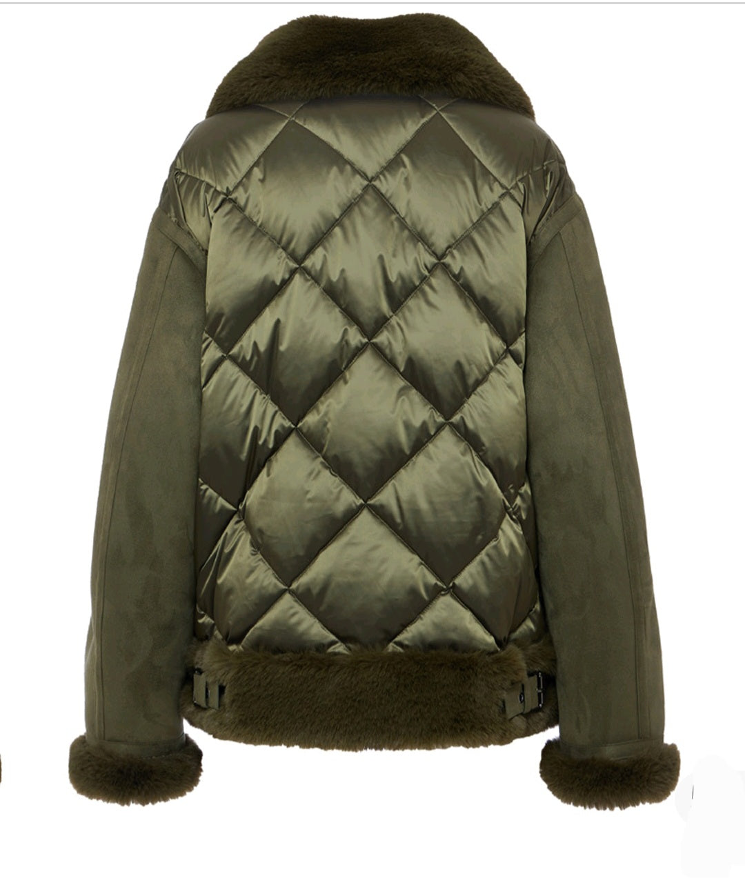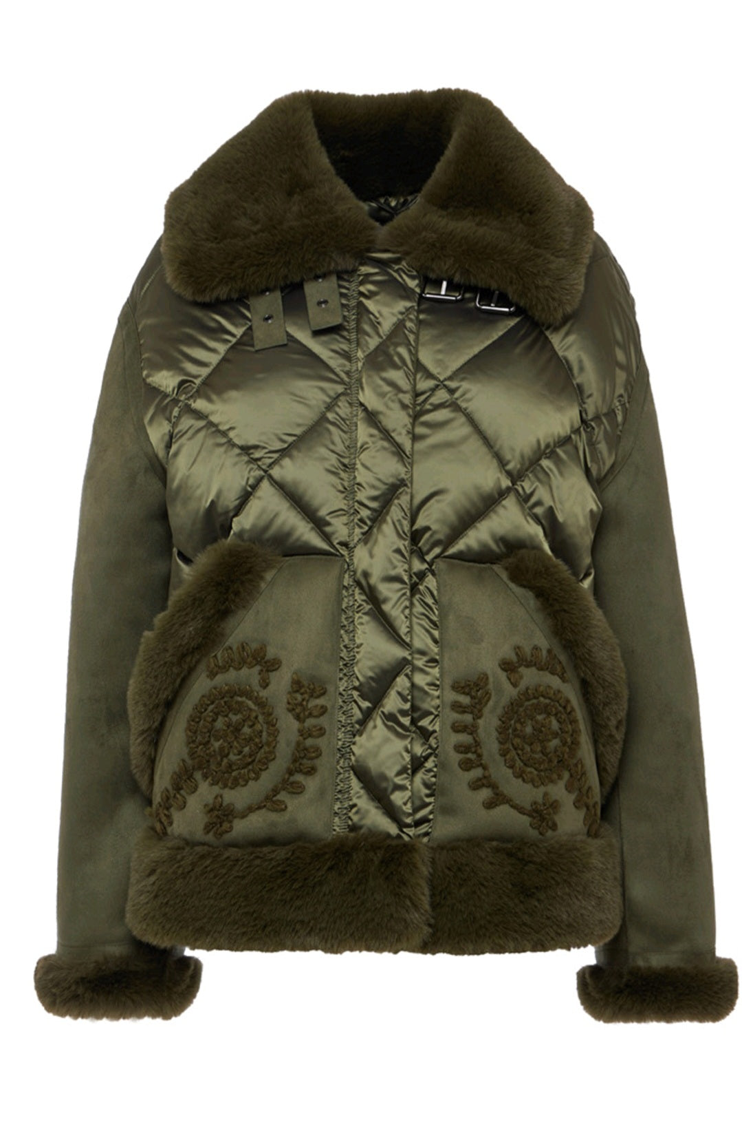 Ecomontone e piumino verde bosco collo ecopelliccia chiusura zip tasche sul davanti ricamate ai lati Violanti ricamo sulle tasche chiusura doppia fibbia al collo sulla mostra davanti bottoni a pressione e doppia zip bordato ecopelliccia in tinta