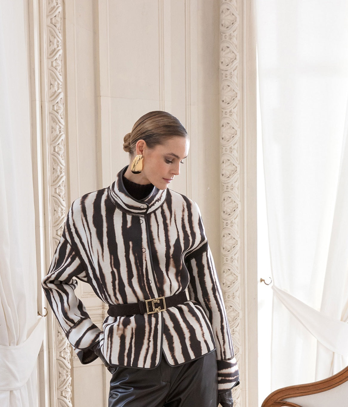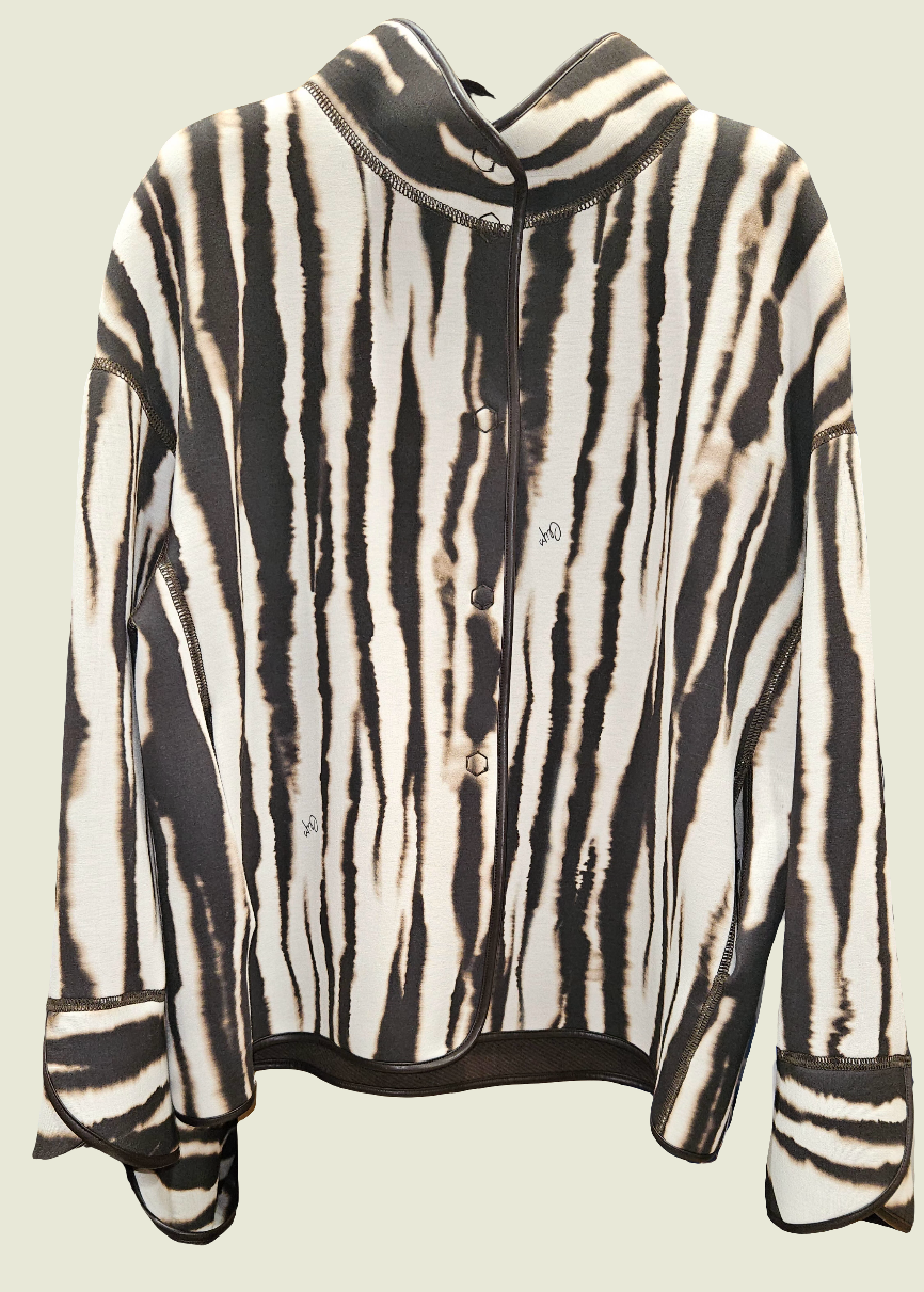 Giacca Clips neoprene impermeabile stampata avorio e marrone chiusura bottoni a pessione tasche laterali cuciture esterne