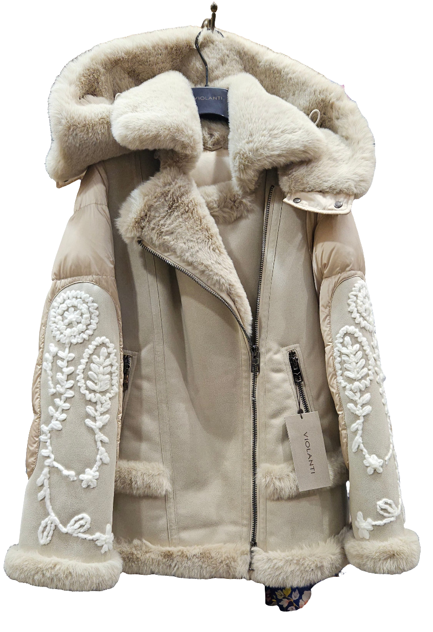 Montone tecnico Violanti tortora maniche in piuma d'oca ricamo cappuccio staccabile doppio cursore tasche zip sul davanti, bordato in ecopelliccia